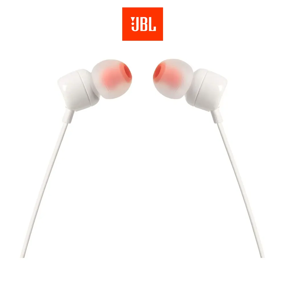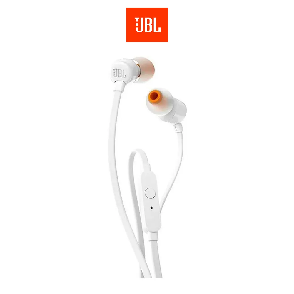 Audífonos in ear con micrófono JBL T110 cable plano, conector 3.5 mm, control de música y llamadas, blanco